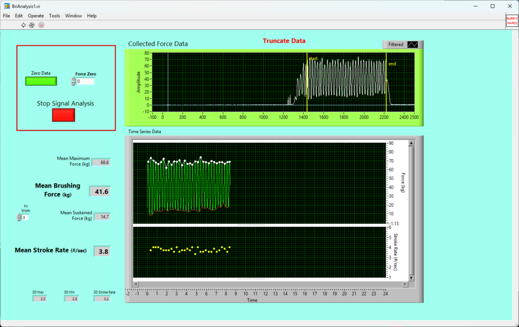 For the calibration work we utilized the lab’s Bertec FP5060-06-PT-2000 model force plate, which has a maximum load capacity of 10,000 Newtons. Bianca Simone configured the force plate to record at 100 Hz, the same sampling rate used by the CurlSmart brush. For ease of understanding, the CurlSmart brush output is automatically converted to kilograms. Consequently, the Bertec force plate’s output was similarly converted from Newtons to kilograms to match the output from the brush.Â