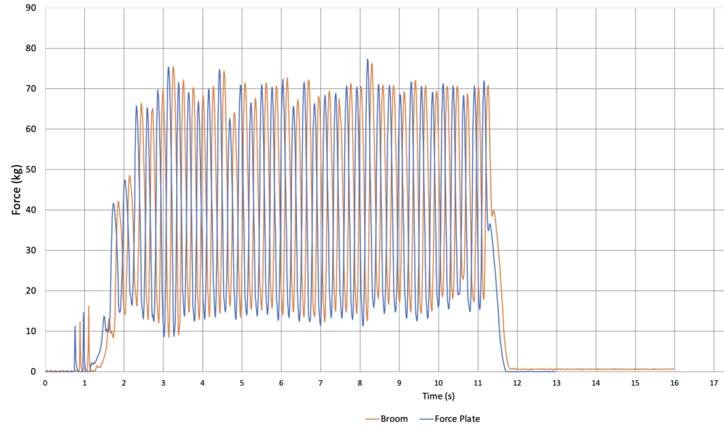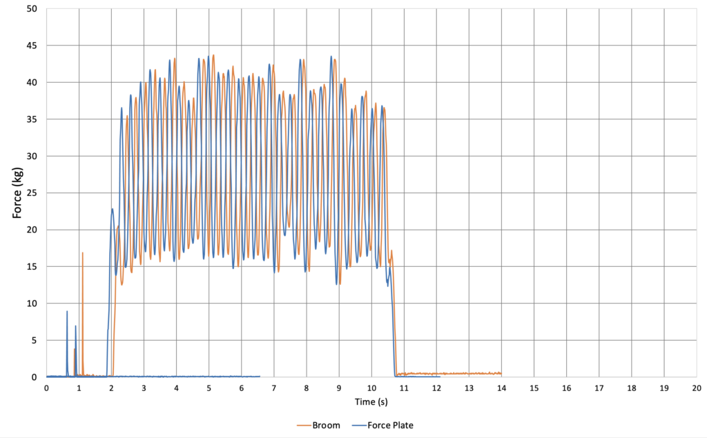 Before anyone gets too excited about the numbers I produced during this trial (normalized mean maximum force of 87%; normalized mean sustained force of 18.7%; normalized mean force of 53%) I must mention that brushing in the sport of curling is all about movement. It is much more diffiicult to produce high force values when one is moving with the stone down a sheet of ice than it is to brush a Telfon sheet in a laboratory while maintaining a stationary stance.Â