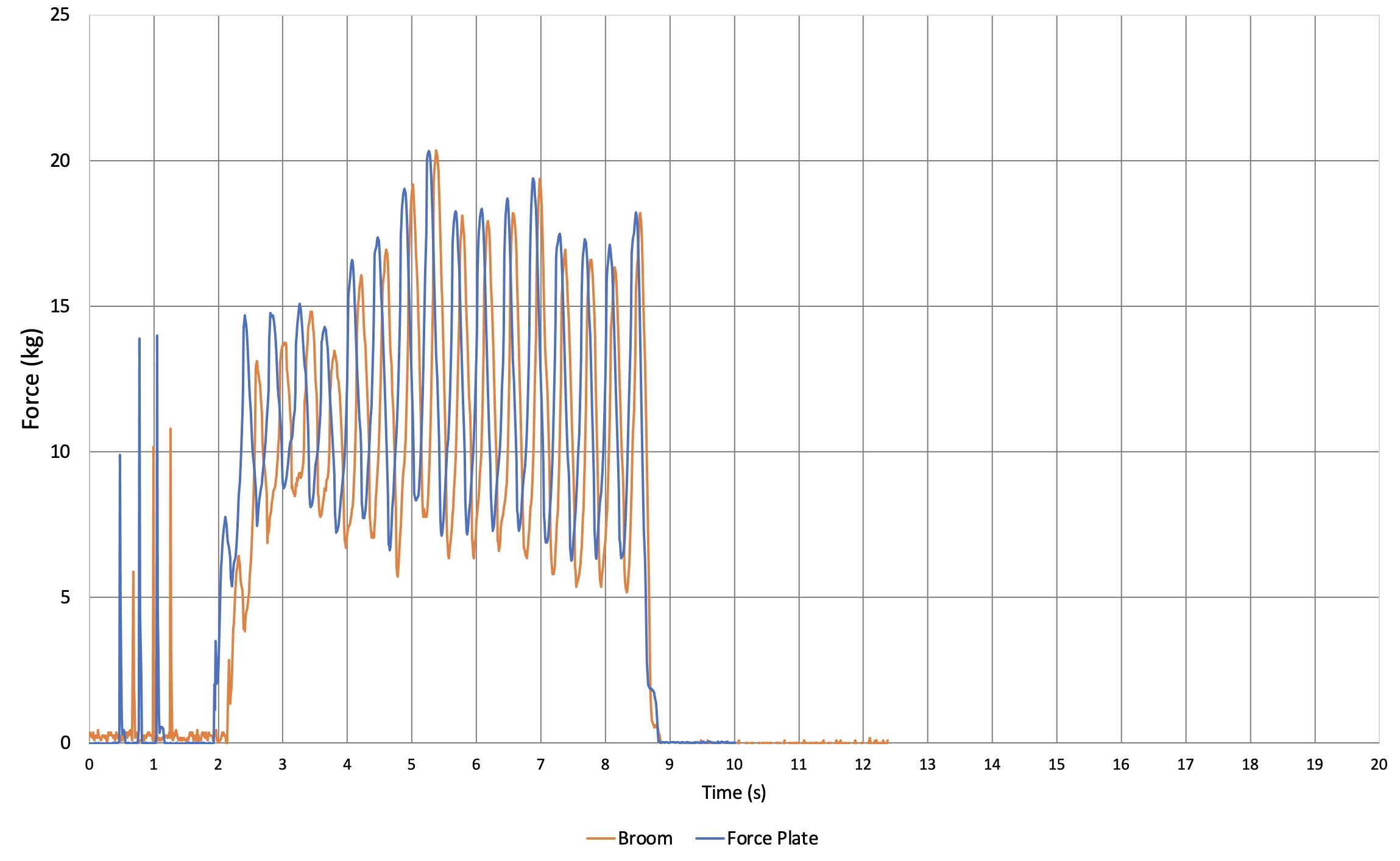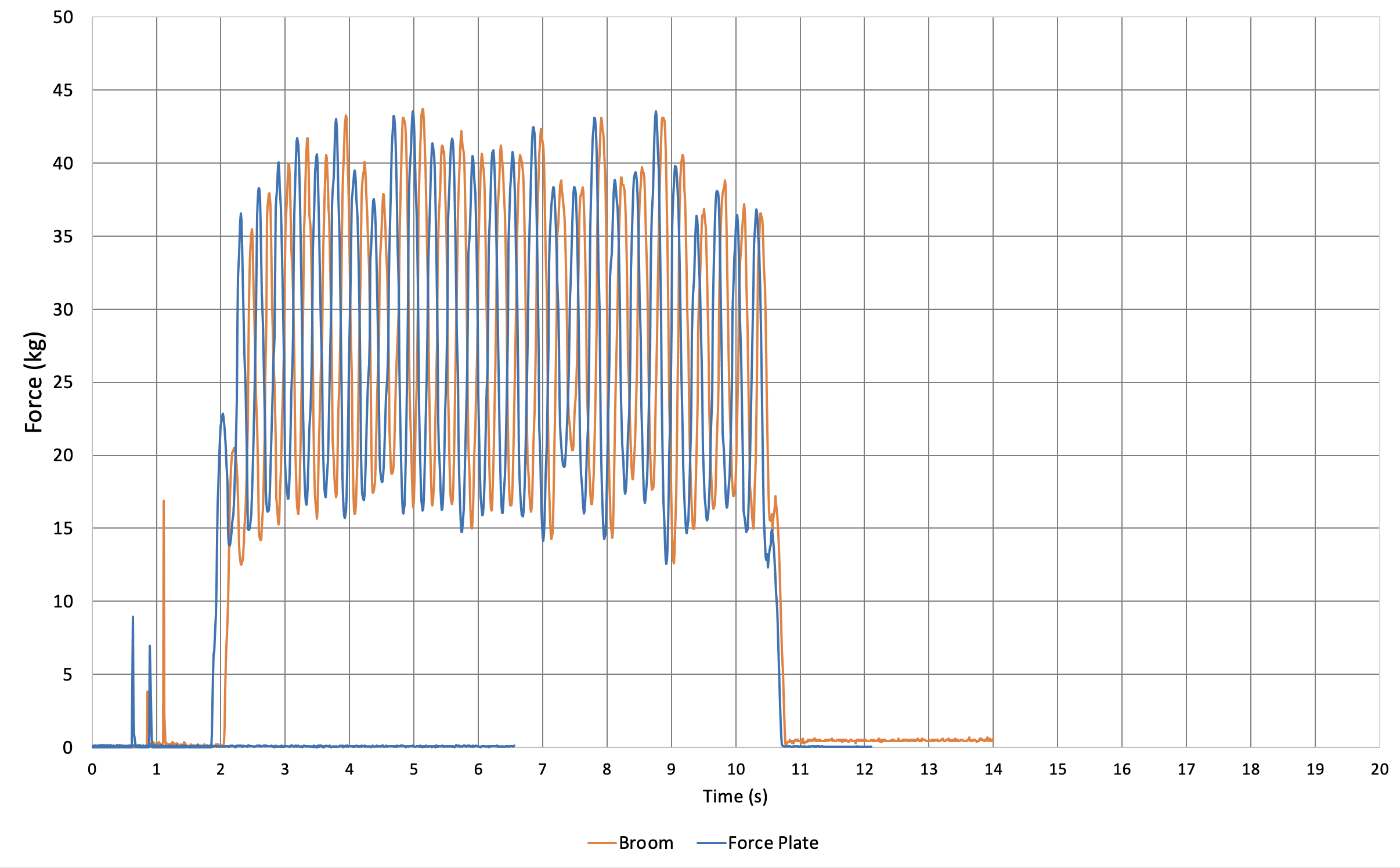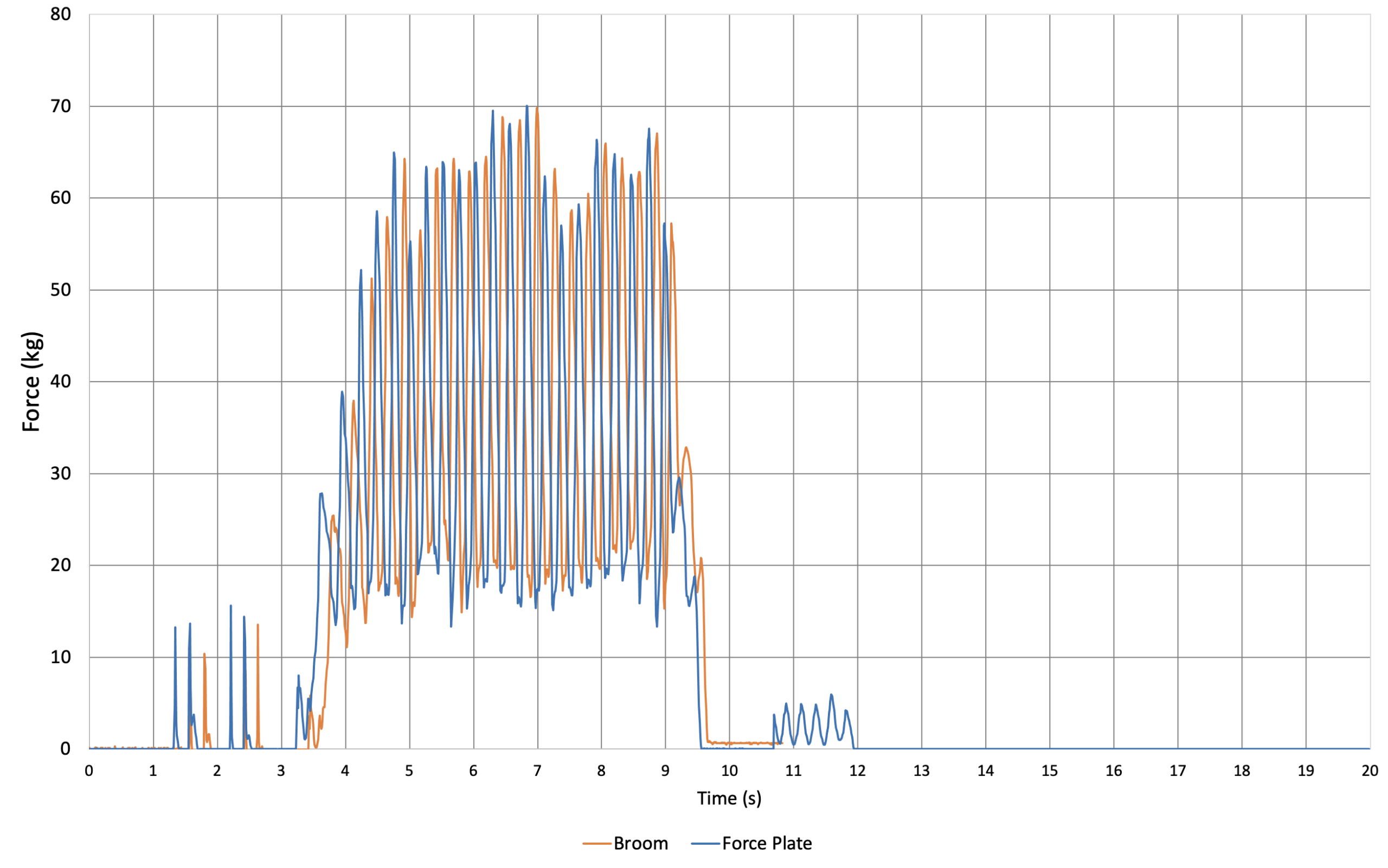 Comparison of CurlSmart output for this bout to that recorded by the force plate. The time series is deliberately offset by approximately 1/10 second so that one can more easily compare the force values recorded by the brush with those recorded by the force plate. This plot uses a brush calibration constant of 0.85 that results in an error of 1.4% for the maximum force value attained during the bout.