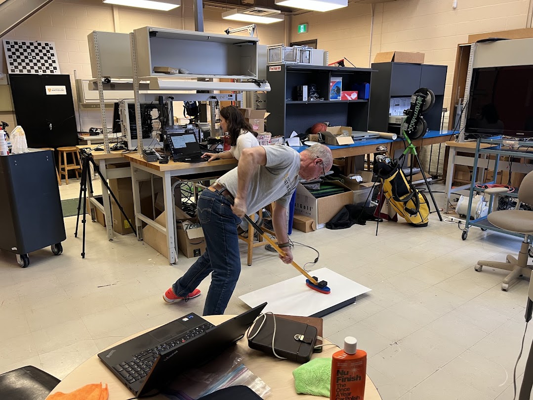 I personally served as the test subject (age: 65; weight: 78.5 kg; height 180 cm) since we were testing the brush rather than any athletes. After recording a few test bouts to ensure that everything was working correctly we proceeded with generating five calibration bouts with varying degrees of effort and varying brush handle angles. We recorded the brush output using the existing brush calibration constant of 0.083, derived from our last calibration experiments performed at Dalhousie University’s BEN lab in the School of Health and Human Performance.Â