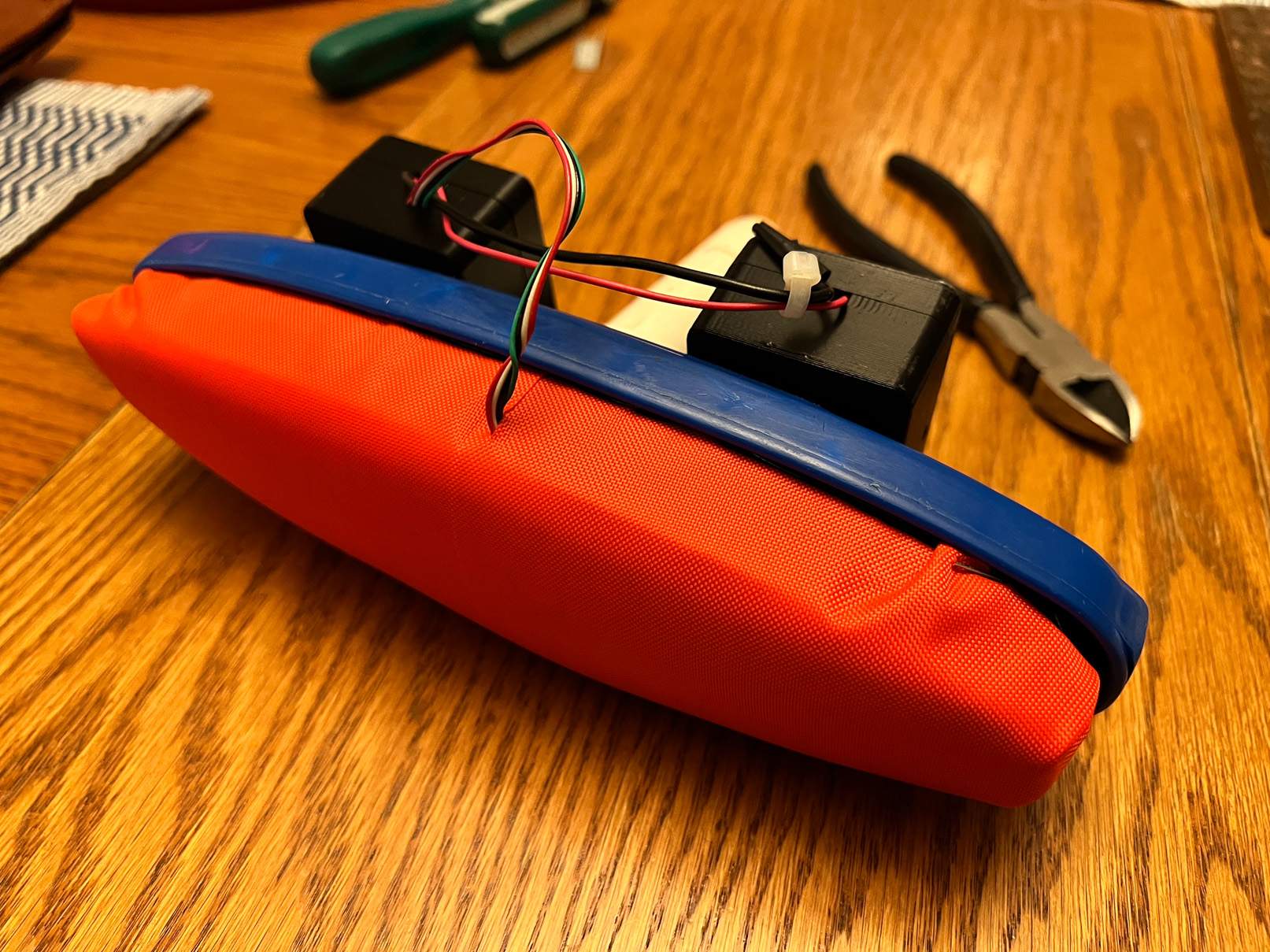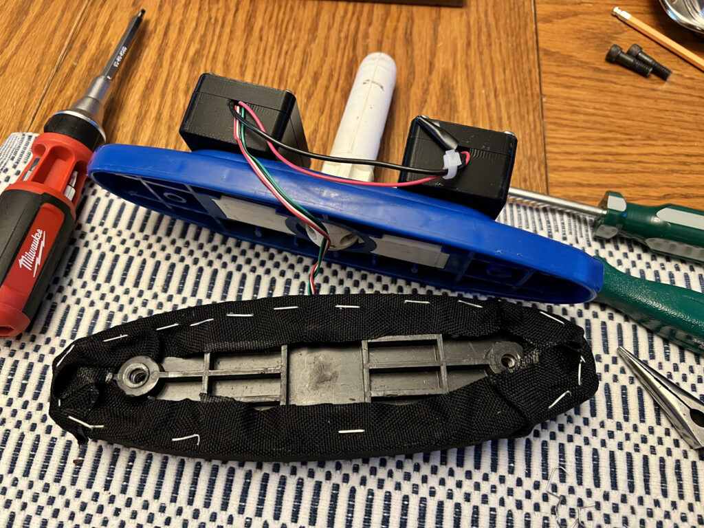 Replacing the black Cordura nylon fabric on the CurlSmart brush with orange SportLite+ fabric from Balance Plus. We are grateful to Dale Matchett of Balance Plus for the sample of SportLite+ fabric to use with the brush.
